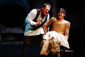 First among them is Adam Scott Campbell’s Sweeney Todd. A huge barrel-chested bear of a man with matinee-idol good looks, he sings the Sondheim score beautifully and brings to Sweeney a touching authenticity of feeling so that we have real sympathy for the monster. His haunted eyes will haunt you. A program note informs that this production marks his return to the stage after a two year hiatus. Let us hope he is back to stay.