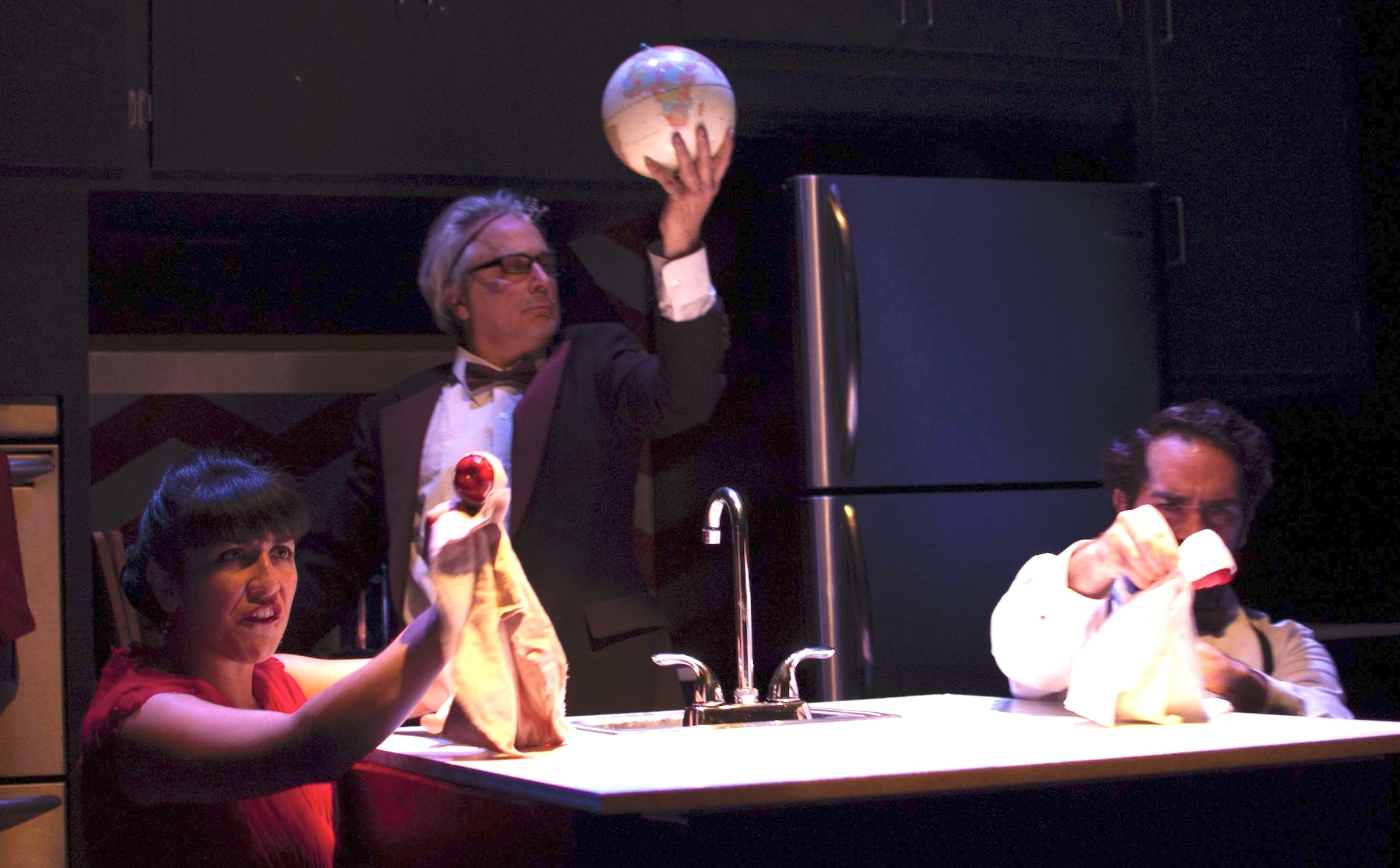 Scenic designer Michael Locher and director Yury Urnov have insightfully set the play in a sparkling upscale kitchen, which serves as a metaphor for the very bowels of Father Ubo’s depraved kingdom: a place of butchering and garbage. At times, characters seem to appear from the underworld, literally emerging from the plumbing, crawling in sewage. Pure id, they climb, creep and toddle about the stage like demonically possessed infants, terrible indeed.