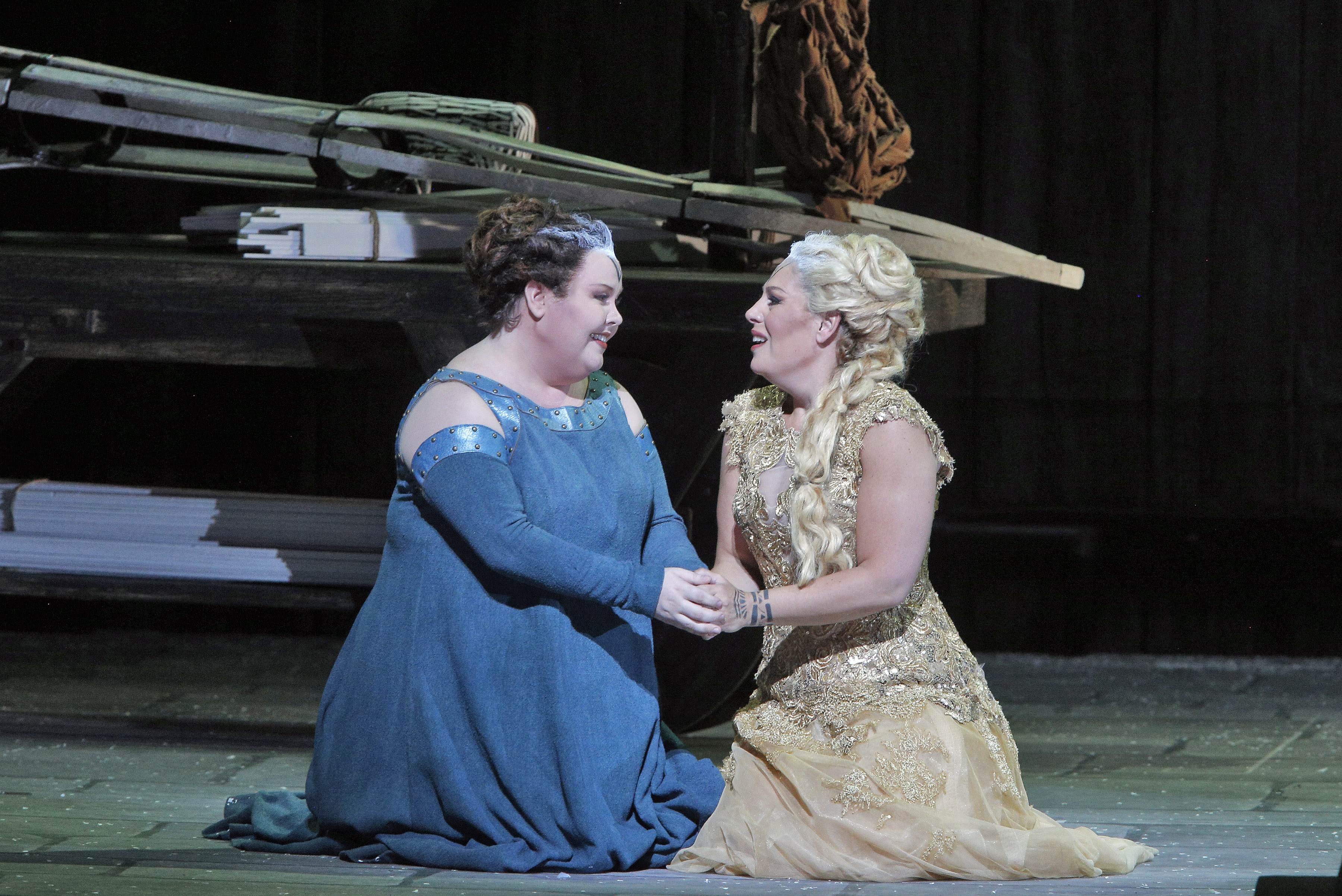 In addition to Radvanovsky’s singing, there are two elements of this “Norma” that are quite wonderful. Firstly, and emphatically, Jamie Barton makes a stunning SF Opera debut as Adalgisa, the young priestess who is Norma’s rival for the love of a Roman occupier. When Barton and Radvanovky sing the famous duet, Sola, furtiva al tempio, the production springs to life. The rendition is musically perfect, the two voices gorgeously blending, every detail of supple melody delineated with care, no harmony lost. The two divas communicate passion and joy in the music that is the emotional highlight of the entire production. It is lovely in every way. Secondly, Jacqueline Piccolino, a first year Adler Fellow, sings well and demonstrates notable acting skills in the role of Clotilde.