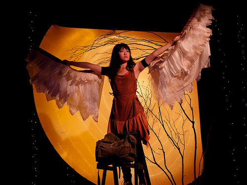 Director Mina Morita has orchestrated the pieces of the drama deftly. The stage is largely comprised of step ladders, boxes, and other components that look like leftovers and back stage implements. But the backdrop is dominated by a glowing moon figure with a silhouetted leafless branches, providing a strong Asian look. A playful prop device is the injured bird, represented by an illuminated bulb covered with fluffy feathers that is raised and lowered from the fly. Another distinction is Sadako’s outfit, which is a brightly layered, reminiscent of another with avian connections who is on a quest – Papageno in “The Magic Flute”.