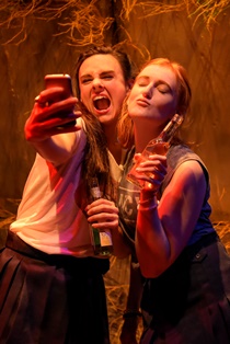 Enter two 14 year old girls in school uniforms. They are rolling on the ground and having a vicious fight in the schoolyard. They are Sam and Kelly. We soon find out that lanky, angular, sharp-tongued Sam embodies the psychological term “acting out.” Jessica Lynn Carroll gives a boundlessly obscene and brilliantly raunchy portrayal of Sam, portraying all the new nastiness and insecurity of a young teen. Carroll’s Sam has been captured by popular culture, international adolescent rebellion, and her own reactive cruel streak. Out of her mouth comes a stream of vituperation, hatred, and insecurity that takes us beneath the surface of our middle class adult lives. These are girls from the streets of a lifeless, arid suburb. They are working class girls who have no respect or love for any adult or friend. Sam lives to please her “boyfriend” Trevor, until she suddenly turns on him, too. She is hateful, hated, and adrift, enslaved to trends, videos, and pervy fads.