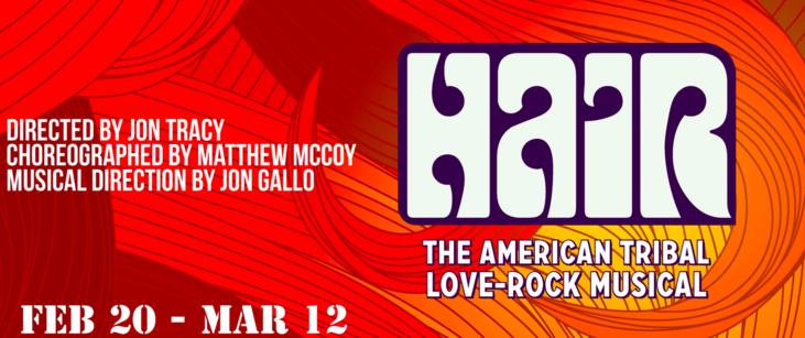 “Hair” with music and lyrics by Galt McDermot and Book and Lyrics by Gerome Ragni and James Rado, produced by Bay Area Musicals. Director: Jon Tracy. Choreographer: Matthew McCoy. Musical Director: Jon Gallo. Stage Manager: Salim Razawi. Costume Designer: Pasquale Spezzano. Scenic/Lighting Designer: Jon Tracy. Sound Designer: Nicholas Rieker. Prop Designer: Matthew McCoy.