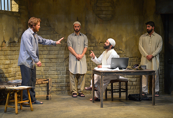 Well, it isn’t long before playwright Akhtar starts messing with audience expectations. Nick’s jailor, Bashir (Pomme Koch) is a Muslim of Pakistani descent, but he is also an Englishman who grew up in London and speaks with a London accent. He is smart and sophisticated, capable of brutality, certainly, but also capable of reason and able to defend his actions as being in the interest of his homeland. He makes a strong case, too, to suggest that Nick is not the innocent bystander in Pakistan’s troubles that he claims to be.