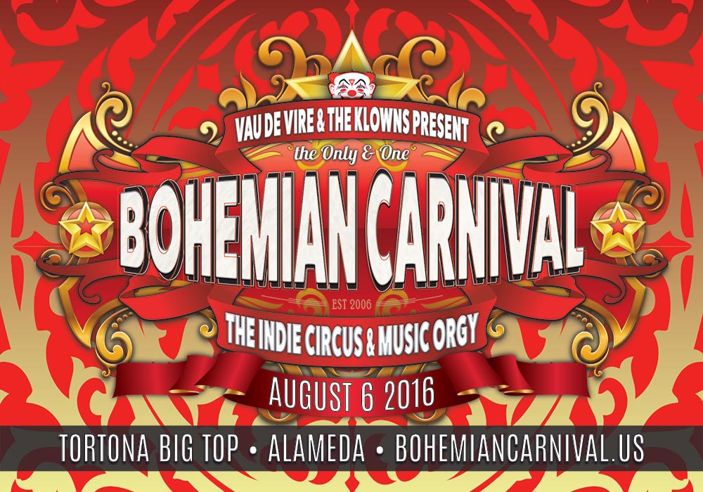On August 6th, 2016, a number of stars aligned and Vau De Vire was able to celebrate the ten year anniversary of their Bohemian Carnival. Per a grand chance, they had a venue. On the island of Alameda, with a foggy San Francisco backdrop, in the middle of an abandoned naval base, months earlier, they had erected an old Italian circus tent for an all immersive stage show (Soiled Dove) that ran for a mere two nights in mid July. After that show closed out, to great success, they must have been caught playing in the Circus tent late at night, they must have fallen in love with this island on an island, with this mirage, this fantasy.