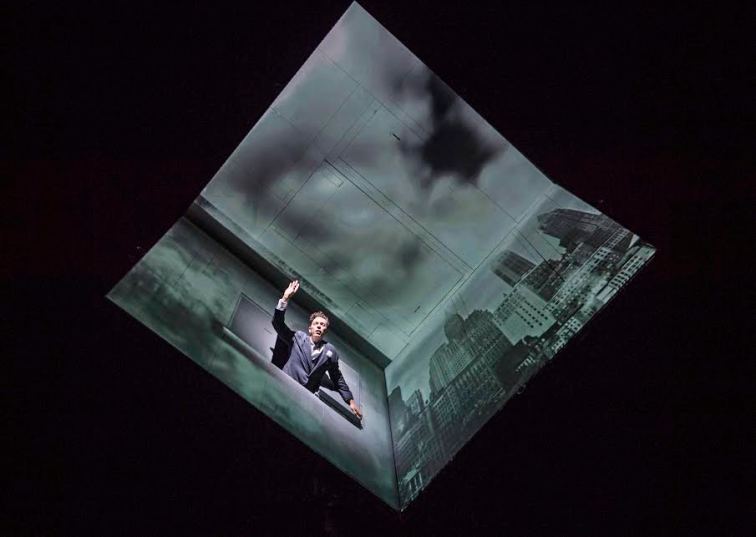 The actors (who are accomplished circus artists) are sometimes sliding down the walls of the cube, sometimes suspended on cables, sometimes performing acrobatic flips in the air to move from scene to scene, and occasionally stepping out of the cube onto the stage floor. It is astonishing and wonderful.