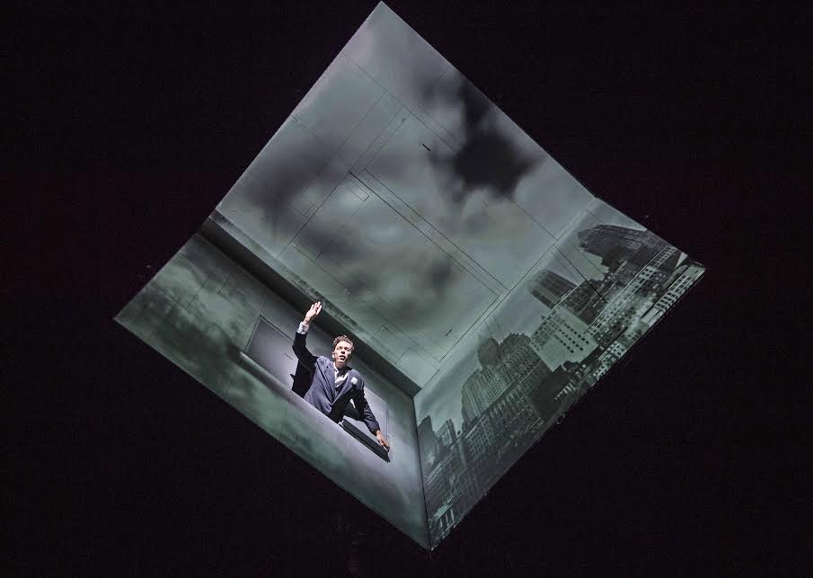 Robert’s efforts to survive his grief and thrive as a creative artist are explored through a series of vignettes involving all the characters that seem to haunt his hotel room. The content is as much visual as vocal, and the emphasis is on feeling rather than plot. The hotel room is represented by a revolving cube suspended over the stage, with actors who appear to be floating, climbing walls, passing through hidden doors, and traveling to other locations including Robert’s recording studio and the streets of New York through the use of ingenious projections. This last effect is an amazing one in which Davis appears to be riding a subway, crossing a busy street, and wandering through alleys. The work by set designer Carl Fillion and images designer Lionel Arnould and the rest of the design crew is incredible.