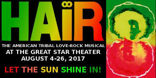 I spent August 4th, 2017, listening, fifty years after its original production, to the first step that “Hair”  took at the Great Star Theater. Does it hold up? Is it a dance step or a forced march? Is it embarrassed after all these years? It certainly had a spring in its step. The crowd seemed happy.