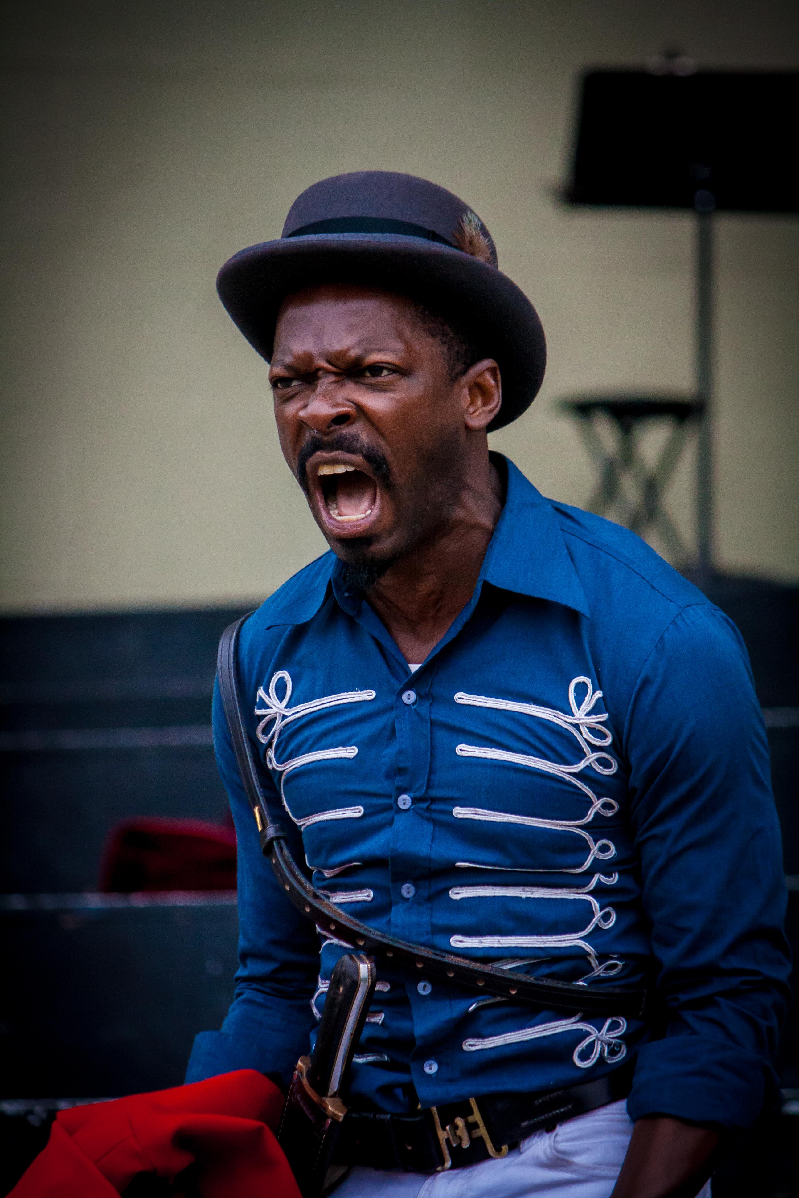 Throughout all the circus action and interesting meanders through the park, this production never loses the line of the story, and as Shakespearean drama it succeeds admirably. The thread is never lost, and all of the actors speak the verse with a high degree of skill and perfect articulation. As Casca, Chris Steele comes on like a demented, two-faced Rex Reed covering politics instead of movie celebrities, and they create a memorable character. Joseph Schommer convincingly portrays Brutus as the ideal of Roman nobility. As the wolf-like Cassius, a co-conspirator, Hunter Scott MacNair is heart-breaking. And Rotimi Agabiaka, playing Marc Antony, delivers the famous funeral oration, as he should, with the force of an operatic aria.