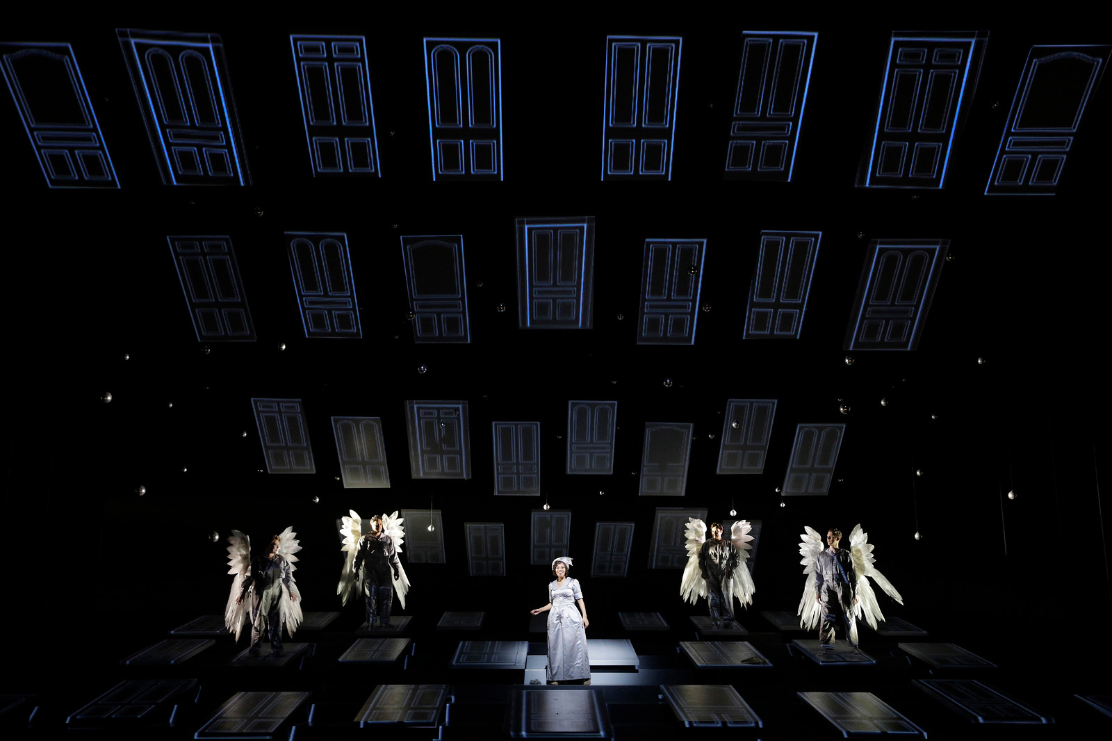 Musically, and for individual performances, this production is wonderfully satisfying. Yet, for all that, it is oddly distant in its emotional range, never quite achieving the warmth of the Capra movie that inspires it. Perhaps the interesting setting by Robert Brill, with its metaphorical doors in the sky and minimalist approach, is too abstract for small town America. I found myself longing for a full, realistic, traditional set that would transport me to a small American town during an evening snow fall, like the one I remember from the movie.