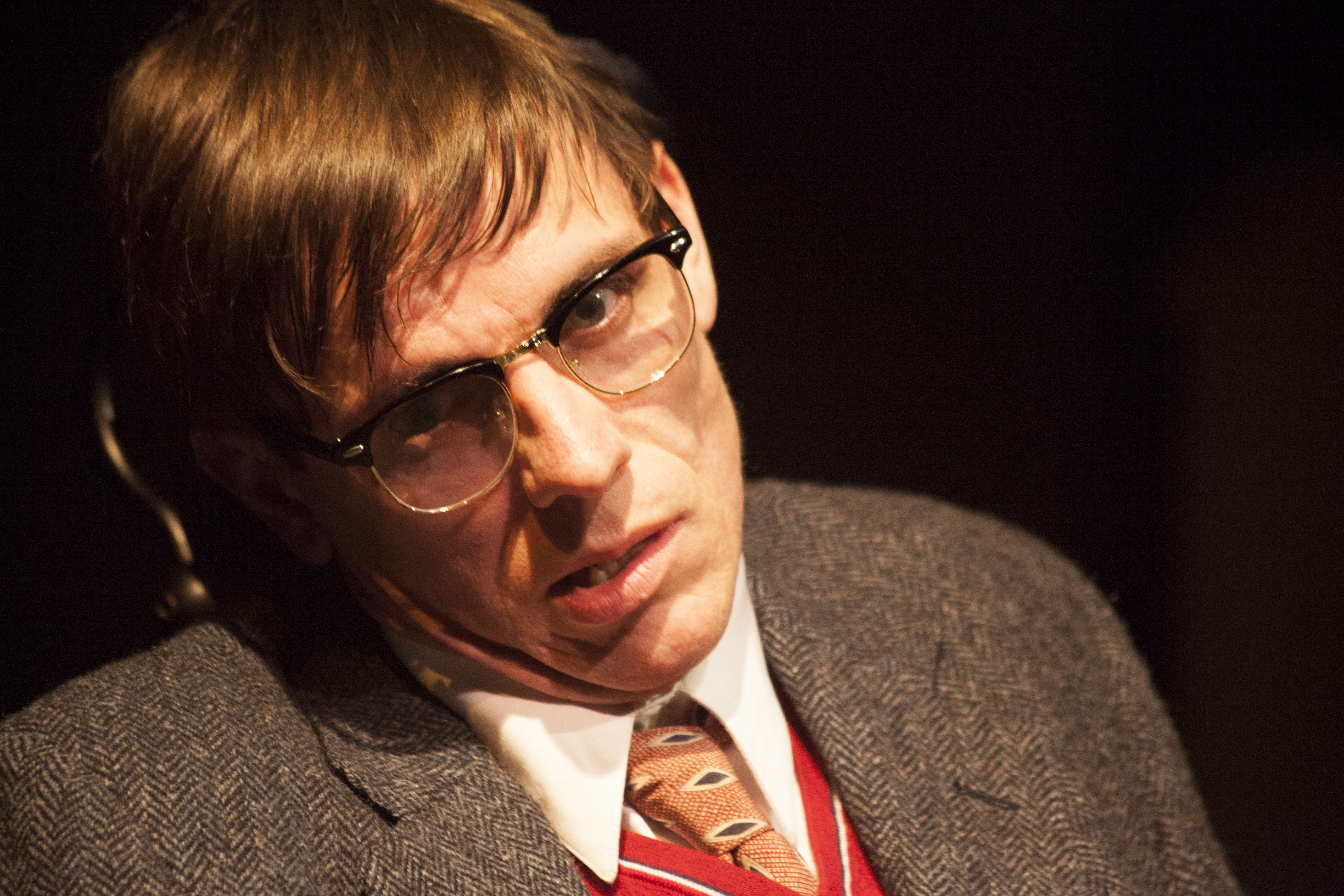 Of course, as we know, he did survive, and thrive. Playwright Coughran reminds us of that fact by having an older, wheel-chair bound Hawking (the excellent Alan Coyne) introduce the play, telling us that we will be seeing an important night from his youth, shortly after his diagnosis, when he attended a New Year’s Eve party at which he would encounter a life changing event. Rising from his chair, he drops 30 years of aging and disease, to present himself as a very young man, handsome, graceful, at the brink of his career, but harboring a tragic secret.