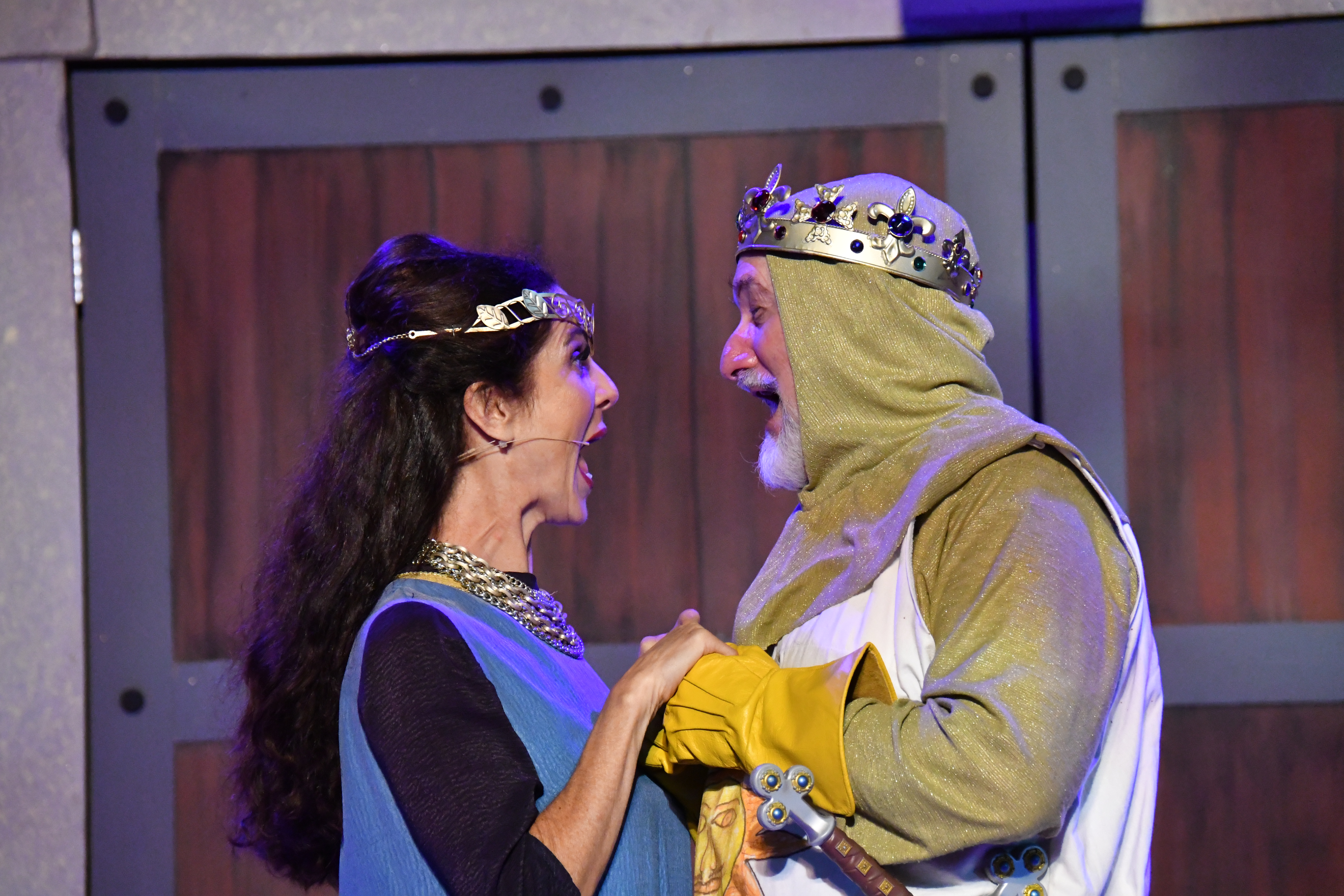 You could search the Bay area from Santa Rosa to San Jose without unearthing an actor with a more distinguished resume than Jarion Monroe, and he has an absolute ball as King Arthur. His steady, deadpan, heartfelt delivery is the perfect foil to the shenanigans unfolding about him. Watch carefully, and you’ll realize that this is a subtle comic turn by a seasoned pro who knows exactly how and when to let his hair down. Susan Zelinsky matches him laugh for laugh as “The Lady of the Lake,” and sings impressively.