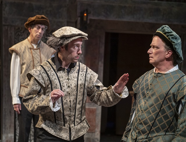 Yusuko Soi’s simple set is effective. Lisa Roman’s costumes were lovely, but having some actors in modern black dress and others in Elizabethan costumes was somewhat jarring.
