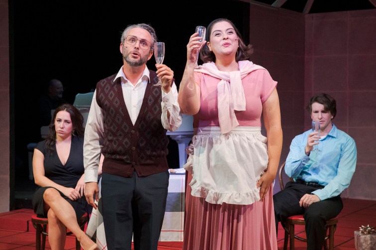 Each of the performers takes on a variety of roles—like they’re in a very good version of “Saturday Night Live” with singing —and all four of them are exceptional, individually and as an ensemble. Samantha Rose Cárdenas is terrific as “Woman #1,” whether she’s playing a severely nerdy young girl who dreams of being a babe, a career-focused twenty-something who decides it’s best not to marry, or a harried mom on a road trip—to name just a few of the characters she plays. Her characterizations are distinct and her voice is great. As “Woman #2,” Haley Lovegren shines. Ms. Lovegren has a fantastic voice that can go from theatrical to lyrically operatic to country—and makes it look easy (and I know it isn’t). Her characters range from a youngster in the back seat during a road trip to an attorney who negotiates the terms of a sex romp to an elderly widow attending a wake—and more—and there is just something riveting about her. I dare you to take your eyes off of her when she’s onstage. You can’t.