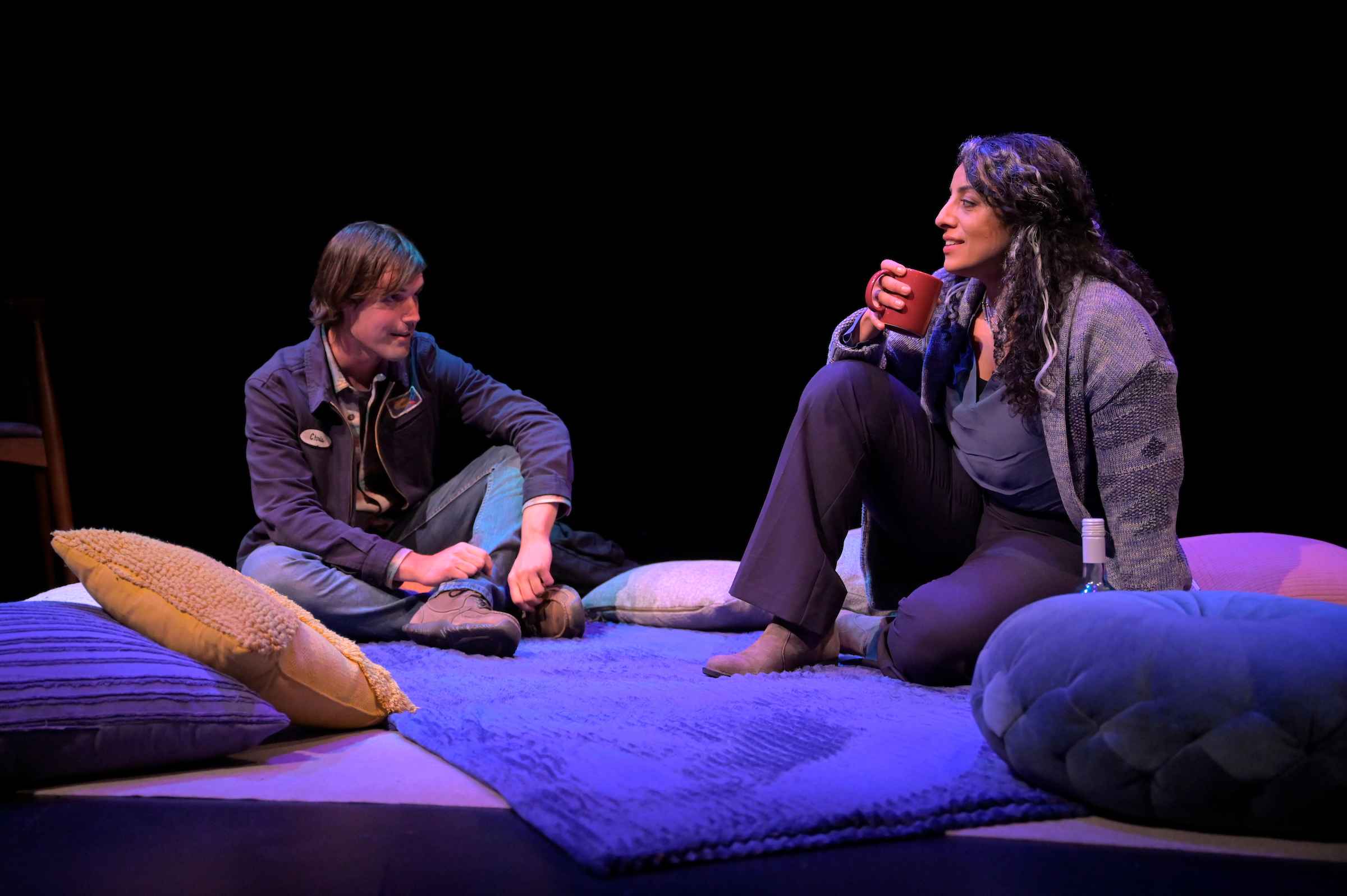 Denmo Ibrahim as Bella Lee Baird carries the lion’s share of the storytelling burden, as the memories are hers. Ms. Ibrahim is wonderfully engaging and self-effacing as she describes her looks, her writing, her teaching abilities, and even her sexual escapades. Watching Ms. Ibrahim directly engage with the audience is to our advantage–it allows us to look into her delightfully expressive eyes to see clearly all of the nuanced emotion written there. Tyler Miclean plays her student, amateur novelist Christopher Dunn, with the requisite dourness of a millennial Harvard undergrad who feels that the university is simultaneously above and beneath him. Through their verbal sparring and their cozy tete-a-tetes on Bella’s pillow-strewn floor, we sense that these two will be getting their May-December on…but I will neither confirm nor deny. It’s beside the point, really. There’s much more going on here than mere collegiate hanky-panky. Jasson Minadakis directs the production with a gentle hand. Scenic designer Edward E. Haynes, Jr.’s sparce settings allow for the flexibility and shifts of memory, making the most of lighting and projection designer Mike Post’s projections which make effective use of the written words of key phrases. These projections give the impression that Bella wants to be writing these memories down–or perhaps we’re seeing a representation of Bella’s writing. Mr. Post’s lighting is shadowy, as memories tend to be, and very effective.