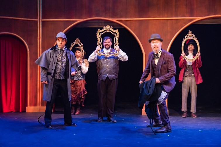 There are several different iterations of a series of plays “that go wrong” that have become popular in the last few years, and “Ken Ludwig’s Baskerville: A Sherlock Holmes Story,” now playing at the Hillbarn Theatre, joins their ranks. The conceit of the show is that a theatrical troupe in 1892 has arrived to put on a play version of the Sherlock Holmes story “The Hound of the Baskervilles,” but most of the actors, sets, and costumes have not yet arrived. Thankfully the actors playing Holmes and Watson are there, but it leaves three actors to fill in more than thirty roles. It is a situation that is ripe for the kind of farce for which Ken Ludwig is known. “Baskerville,” however, does not quite get where it needs to go, notwithstanding a terrific cast.
